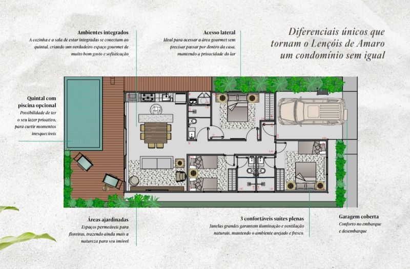 Casas com 3 Quartos (3 Suítes), 3 Banheiros, Sala de Estar/Jantar, Cozinha, Garagem, Condomínio Fechado com Segurança e Área de Lazer, nos Lençóis Maranhenses, Santo Amaro-MA, Brasil.